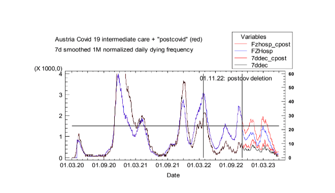 Wenn es einen gesundheitspolitischen Konsens gibt – von ethischen Grundsätzen (Hypokratischer Eid „primum non nocere“) einmal ganz abgesehen – dann jenen, dass vollständige, integre und kontinuierlich gepflegte Datenbanken und deren statistische Auswertung (Hospitalisationsraten, infection fatality rate, case fataliy rate, ..) die Grundlage für kurzfristige Entscheidungen und langfristige Strategien eine absolut unverzichtbare Voraussetzung sind. Jedoch wurde bereits im November 22 auf wessen Geheiß auch immer die Datenerfassung der Hospitalisation mit Covid19 so umgestellt, dass danach plötzlich sogenannte „Post- Covid Patientinnen“ – jene, welche auch nach 14 Tagen das Spital nicht verlassen konnten – dennoch als nicht mehr Covid19 infiziert aus der Statistik gelöscht waren (Abb2.). Dies hatte auch eine wundersame rund 30%-ige Abnahme der an Covid Verstorbenen zur Folge. Allerdings ist dies nachvollziehbar und korrigierbar (Abb.2 rote Linien)